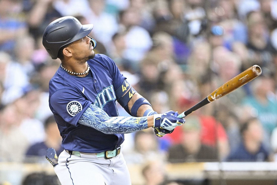 Jun 9, 2024; San Diego, California, USA; Seattle Mariners center fielder Julio Rodriguez (44) hits a solo home run during the fifth inning against the San Diego Padres at Petco Park. Mandatory Credit: Denis Poroy-USA TODAY Sports at Petco Park. Cuando se le preguntó al manager de Seattle, Scott Servais, si Julio Rodríguez volvería a la alineación el lunes por la noche cuando los Marineros abran una serie de tres juegos contra los visitantes Angelinos de Los Ángeles, le recordó a un periodista que “no es um médico”.