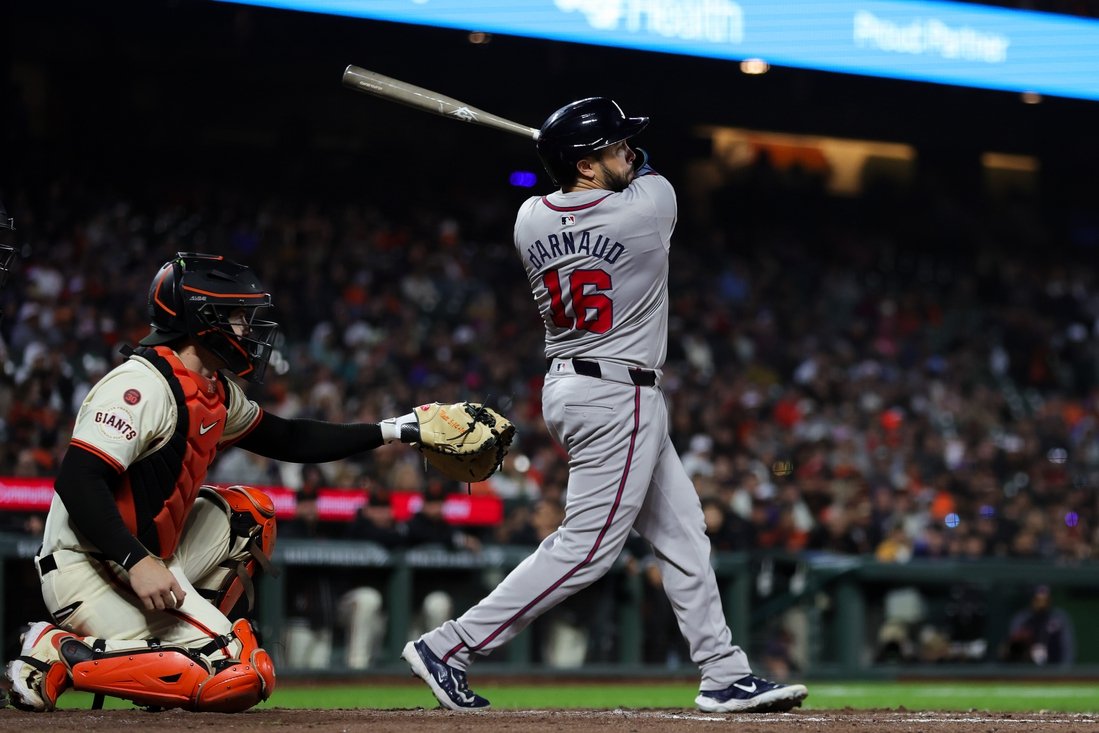 MLB: Atlanta Braves at San Francisco GiantsAug 12, 2024; San Francisco, California, USA; Atlanta Braves catcher Travis d’Arnaud (16) hits an RBI sac fly during the tenth inning against the San Francisco Giants at Oracle Park. Mandatory Credit: Sergio Estrada-USA TODAY Sports