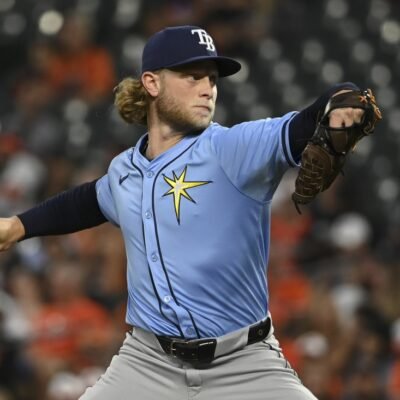 Sep 6, 2024; Baltimore, Maryland, USA; Tampa Bay Rays pitcher Shane Baz (11) throws a second inning pitch against the Baltimore Orioles at Oriole Park