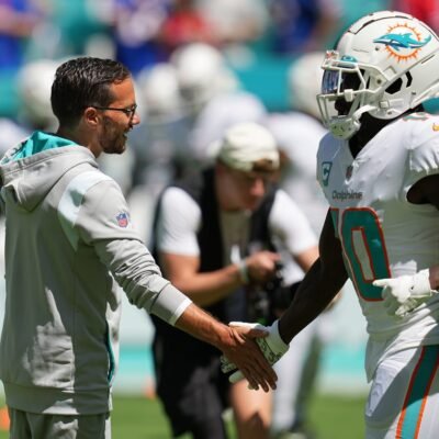 Miami Dolphins head coach Mike McDaniel greets Tyreek hill during warm-ups before the game against the Buffalo Bills at Hard Rock Stadium in Miami Gardens,