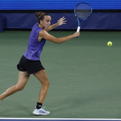 Aug 28, 2024; Flushing, NY, USA; Clara Burel (FRA) hits a backhand against Victoria Azarenka (not pictured) in a women’s singles match on day three