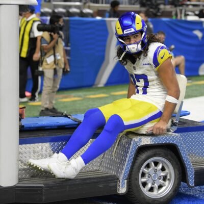 Sep 8, 2024; Detroit, Michigan, USA; Los Angeles Rams wide receiver Puka Nacua (17) is carted off the field after being injured against the Detroit
