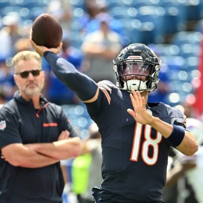 Chicago Bears quarterback Caleb Williams (18) throws a pass in warm ups with head coach Matt Eberflus looking on before a preseason game against the