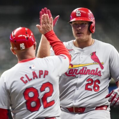 Sep 4, 2024; Milwaukee, Wisconsin, USA; St. Louis Cardinals pinch hitter Luken Baker (26) high fives first base coach Stubby Clapp (82) after driving in