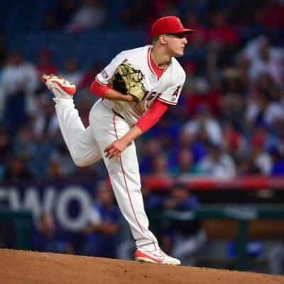 Aug 30, 2024; Anaheim, California, USA; Los Angeles Angels pitcher Samuel Aldegheri (66) throws against the Seattle Mariners during the fourth inning in his major