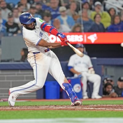 Sep 3, 2024; Toronto, Ontario, CAN; Toronto Blue Jays first baseman Vladimir Guerrero Jr. (27) hits a double against the Philadelphia Phillies during the eighth
