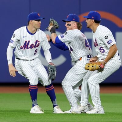 Sep 4, 2024; New York City, New York, USA; New York Mets left fielder Brandon Nimmo (9) and center fielder Harrison Bader (44) and right