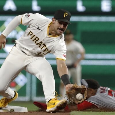 Sep 5, 2024; Pittsburgh, Pennsylvania, USA; Pittsburgh Pirates second baseman Nick Gonzales (39) takes a throw at second base to record a force-out of Washington