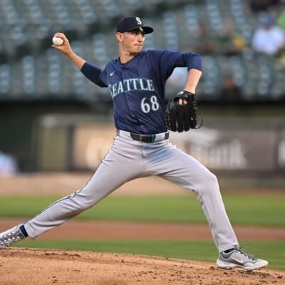 Sep 4, 2024; Oakland, California, USA; Seattle Mariners starting pitcher George Kirby (68) throws against the Oakland Athletics in the first inning at Oakland-Alameda County