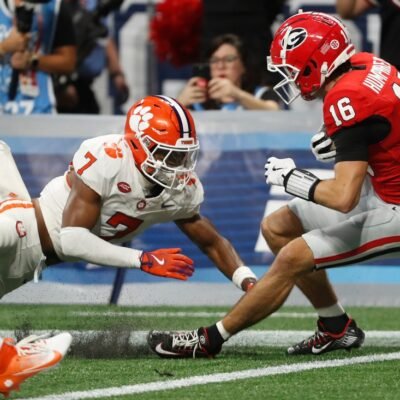 Georgia wide receiver London Humphreys (16) drives past Clemson safety Khalil Barnes (7) for a touchdown during the second half of the NCAA Aflac Kickoff