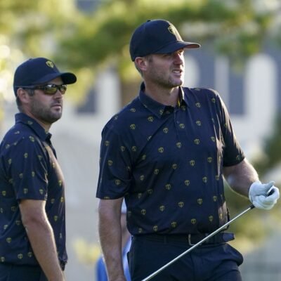 Sep 23, 2022; Charlotte, North Carolina, USA; International Team golfer Corey Conners (left) and golfer Taylor Pendrith (right) on the 18th hole during the four-ball