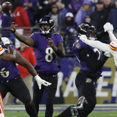 Jan 28, 2024; Baltimore, Maryland, USA; Baltimore Ravens quarterback Lamar Jackson (8) passes the ball against the Kansas City Chiefs in the AFC Championship football
