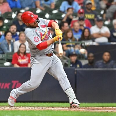 Sep 3, 2024; Milwaukee, Wisconsin, USA; St. Louis Cardinals catcher Pedro Pagés (43) gets a base hit against the Milwaukee Brewers in the fourth inning