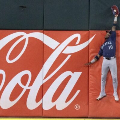 Sep 3, 2024; Oakland, California, USA; Seattle Mariners right fielder Victor Robles (10) leaps to catch a deep fly ball by Oakland Athletics third baseman