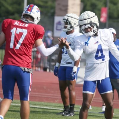 Bills quarterback Josh Allen works on the unique handshake with running back James Cook during day five. AFC East division preview 2024 predicted order of