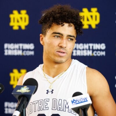 Notre Dame wide receiver Jordan Faison addresses media after a Notre Dame football practice at Irish Athletic Center on Thursday, Aug. 15, 2024, in South