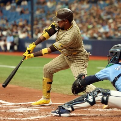 Sep 1, 2024; St. Petersburg, Florida, USA; San Diego Padres first base Luis Arraez (4) singles against the Tampa Bay Rays during the third inning