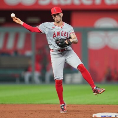 Aug 21, 2024; Kansas City, Missouri, USA; Los Angeles Angels shortstop Zach Neto (9) throws to first base during the fourth inning against the Kansas