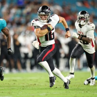 Aug 9, 2024; Miami Gardens, Florida, USA; Atlanta Falcons quarterback Nathan Rourke (16) runs with the ball against the Miami Dolphins in the fourth quarter