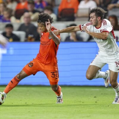 Aug 24, 2024; Houston, Texas, USA; Houston Dynamo FC forward Lawrence Ennali (37) attempts to control the ball as Toronto FC defender Kobe Franklin (19)