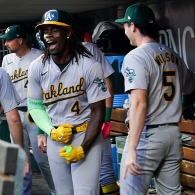 Oakland Athletics right fielder Lawrence Butler (4) reacts after hitting his second home run of the game during the ninth inning of the MLB game