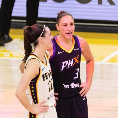Indiana Fever guard Caitlin Clark (22) and Phoenix Mercury guard Diana Taurasi (3) talk at half court during a free throw on June 30, 2024,