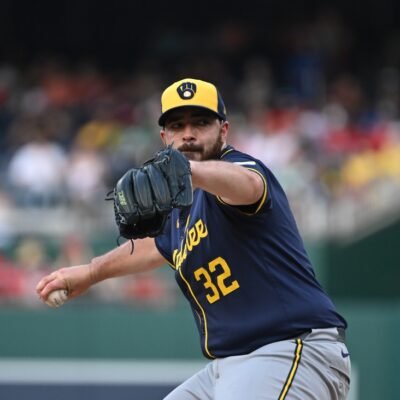 Aug 3, 2024; Washington, District of Columbia, USA; Milwaukee Brewers starting pitcher Aaron Civale (32) throws a pitch against the Washington Nationals during the first