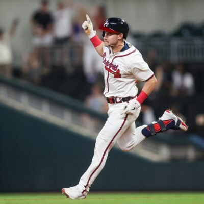 Aug 7, 2024; Atlanta, Georgia, USA; Atlanta Braves center fielder Jarred Kelenic (24) hits a home run against the Milwaukee Brewers in the ninth inning