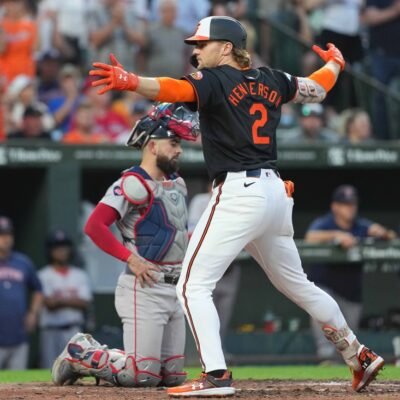Aug 15, 2024; Baltimore, Maryland, USA; Baltimore Orioles shortstop Gunnar Henderson (2) reacts following his two run home run in the fourth inning against the