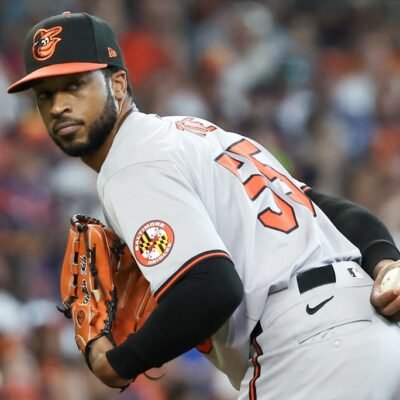 Jun 23, 2024; Houston, Texas, USA; Baltimore Orioles relief pitcher Dillon Tate (55) checks the runner at first base against the Houston Astros in the