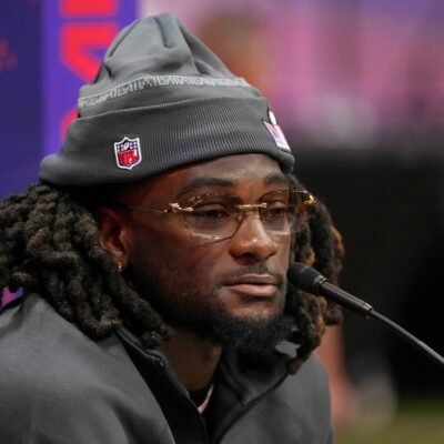 Feb 5, 2024; Las Vegas, NV, USA; San Francisco 49ers wide receiver Brandon Aiyuk (11) talks to the media during Super Bowl LVIII Opening Night
