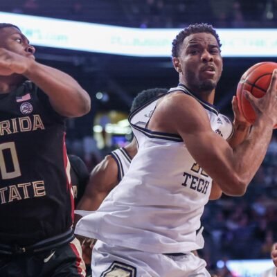 Mar 2, 2024; Atlanta, Georgia, USA; Georgia Tech Yellow Jackets forward Tyzhaun Claude (12) grabs a rebound past Florida State Seminoles guard Chandler Jackson (0)