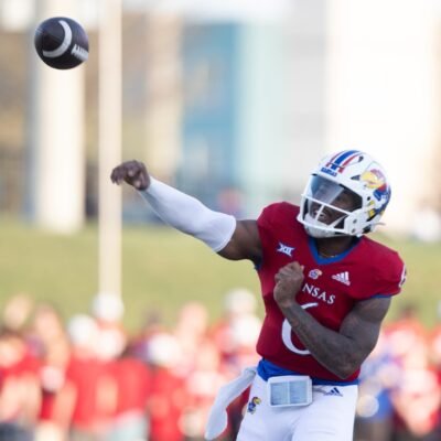 Kansas redshirt junior quarterback Jalon Daniels (6) fires off a pass during Friday’s Spring Preview at Rock Chalk Park. No. 22 Kansas begins its nomadic