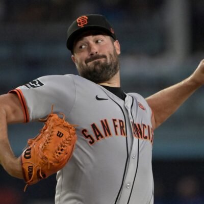 Jul 24, 2024; Los Angeles, California, USA; San Francisco Giants starting pitcher Robbie Ray (38) delivers to the plate in the third inning against the