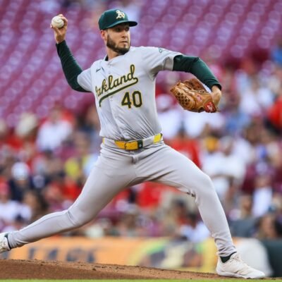 Aug 27, 2024; Cincinnati, Ohio, USA; Oakland Athletics starting pitcher Mitch Spence (40) pitches against the Cincinnati Reds in the first inning at Great American