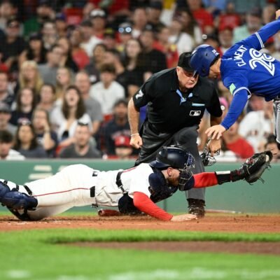 Aug 27, 2024; Boston, Massachusetts, USA; Boston Red Sox catcher Danny Jansen (28) tags out Toronto Blue Jays third baseman Ernie Clement (28) at home