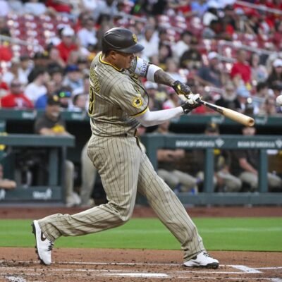 Aug 27, 2024; St. Louis, Missouri, USA; San Diego Padres third baseman Manny Machado (13) hits a solo home run against the St. Louis Cardinals