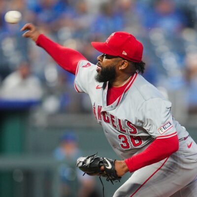 Aug 21, 2024; Kansas City, Missouri, USA; Los Angeles Angels starting pitcher Johnny Cueto (36) pitches during the fourth inning against the Kansas City Royals