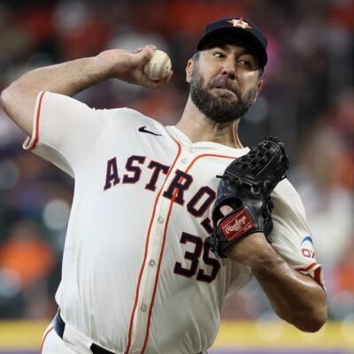Aug 21, 2024; Houston, Texas, USA; Houston Astros starting pitcher Justin Verlander (35) pitches against the Boston Red Sox in there second inning at Minute