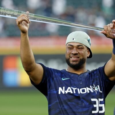 Jul 11, 2023; Seattle, Washington, USA; National League catcher Elias DIaz of the Colorado Rockies (35) holds up the MVP trophy after winning the 2023