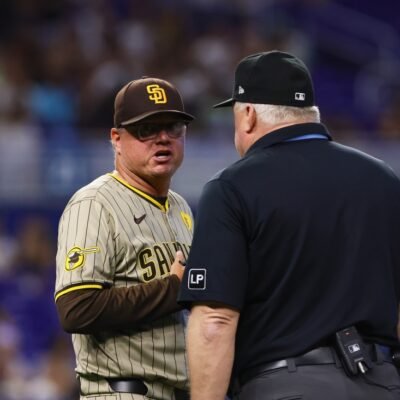 Aug 11, 2024; Miami, Florida, USA; San Diego Padres manager Mike Shildt (8) talks to first base umpire Bill Miller (26) after a ground-rule double