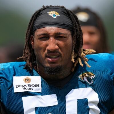 Jacksonville Jaguars defensive end Trevis Gipson (50) walks off the field during a combined NFL football training camp session between the Tampa Bay Buccaneers and