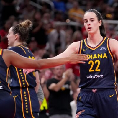 Indiana Fever guard Caitlin Clark (22) and guard Kelsey Mitchell (0) celebrate during the first half of a game Sunday, Aug. 18, 2024, at Gainbridge