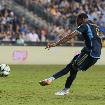 Aug 17, 2024; Chester, Pennsylvania, USA; Philadelphia Union midfielder Jose Martinez (8) scores during a penalty shoot out in a Leagues Cup quarterfinal match against