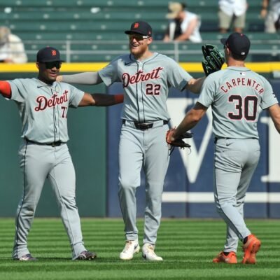 Aug 25, 2024; Chicago, Illinois, USA; The Detroit Tigers celebrate after defeating the Chicago White Sox at Guaranteed Rate Field. Mandatory Credit: Patrick Gorski-USA TODAY