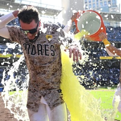 Aug 25, 2024; San Diego, California, USA; San Diego Padres center fielder Jackson Merrill (3) is doused by third baseman Tyler Wade (14) after hitting
