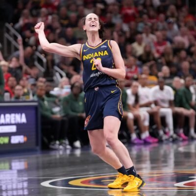 Indiana Fever guard Caitlin Clark (22) reacts as she misses a three-point field goal during the second half of a game against the Seattle Storm