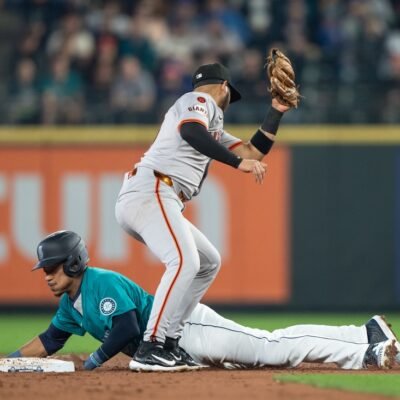 Aug 23, 2024; Seattle, Washington, USA; Seattle Mariners second baseman Jorge Polanco (7) steals second base ahead of a tag by San Francisco Giants second