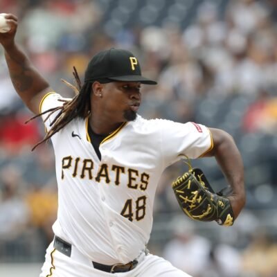 Aug 25, 2024; Pittsburgh, Pennsylvania, USA; Pittsburgh Pirates starting pitcher Luis L. Ortiz (48) delivers a pitch against the Cincinnati Reds during the first inning