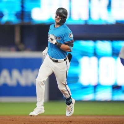 Aug 25, 2024; Miami, Florida, USA; Miami Marlins designated hitter Connor Norby (24) rounds the bases after hitting a home run in the first inning